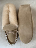 Ladies traditional moccasin made from top quality English suede upper with luxurious sheepskin lining and an extra deep snug sheepskin collar with adjustable lace and soft suede sole.