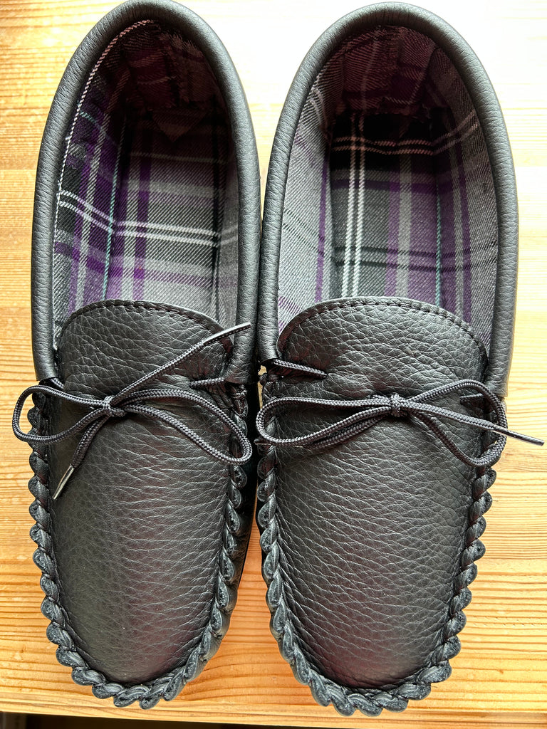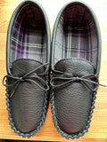 Gents leather moccasin shoe design made with top quality in Nutmeg & Black leather with tartan lining adjustable lace and PVC sole.